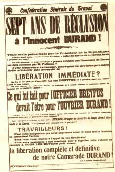 ![]() Dans les archives de la police, il est question de nombreux groupes anarchistes qui, de 1887 à 1930, firent parler d'eux.: groupe anarchiste du Havre, groupe anarchiste révolutionnaire, groupe " Ni Dieu ni maître ", colonie communiste, etc. Jules Durand, militant syndicaliste-révolutionnaire C'est dans cette ville, dans une famille ouvrière vivant le long des docks que naît, le 6 septembre 1880, Jules Durand. Très tôt amené à travailler, il fréquente l'université populaire des Bourses du travail, le soir après les heures de travail. C'est là qu'il découvre les écrits de Proudhon, Louise Michel, Pouget, etc., et qu'il prend conscience de la lutte des classes, qu'il se lance dans le militantisme syndicaliste-révolutionnaire. Ses activités syndicalistes ne sont pas du goût de tout le monde et entraînent son licenciement de la société d'affrètement où il travaillait comme docker. A partir de ce moment, il devient, comme son père, charbonnier-journalier ; mais comme ses idées sont connues de l'employeur, il ne trouve du travail que lorsqu'il y a vraiment beaucoup de boulot. Ce qui l'arrange : les jours où il ne travaille pas, il participe activement à l'organisation syndicale. Devenant secrétaire du syndicat corporatiste des charbonniers, il le fait adhérer à l'union locale des Bourses du travail et à la C.G.T. ; il participe étroitement à la formation de l'union départementale des syndicats. La jeune union des charbonniers devient vite importante et compte, début 1910, plus de 400 adhérents. Les charbonniers forment une corporation ouvrière importante au Havre, cette ville vivant principalement du commerce du charbon. D'ailleurs la ville ouvrière et les docks ressemblent plus, à cette époque, aux corons du Nord qu'à une ville normande. En août 1910, le syndicat des charbonniers lance une grève illimitée "contre l'extension du machinisme, contre la vie chère, pour une hausse des salaires et le paiement des heures supplémentaires". La grève est très bien suivie et Jules Durand se démène en démarches et collectes de solidarité. Pour contrer le mouvement de grève, la Compagnie transatlantique embauche des jaunes -on les appelle ici des renards- qu'elle paye triple. Le 9 septembre, Dongé, un des jaunes, ayant travaillé sans arrêt les 7 et 8 septembre et étant en plus, en état d'ivresse, menace de son revolver quatre charbonniers -grévistes, mais non syndiqués- aussi ivres que lui. Les quatre hommes ripostent aux menaces et le frappent, si fort que Dongé doit être emmené à l'hôpital où il meurt le 10 septembre. Les quatre coupables sont arrêtés. Trouvant que le mouvement de grève dure trop longtemps à leur goût et voulant se débarrasser de Jules Durand pour quelques temps en l'envoyant en prison, la Compagnie générale transatlantique, la bourgeoisie locale et sa presse, avec en première ligne Le Havre Eclair, exploitent le fait divers et achètent le témoignage de charbonniers qui affirment que l'assassinat de Dongé a été voté par le syndicat, à l'instigation de Durand, le 14 août. Même le chef de. la Sureté du Havre dénonce cette machination grossière, maïs Jules Durand est arrêté, ainsi que les frères Boyer (secrétaire adjoint et trésorier du syndicat). L'affaire Dreyffus du pauvre L e procès a lieu en novembre 1910 à la Cour d'assise de Rouen. L'avocat général ne fait pas dans la dentelle et veut vraiment défendre sa classe contre les anarchistes ; il n'évite pas les coups bas en dénonçant avec acharnement Jules Durand, comme buveur d'eau et membre d'une ligue anti-alcoolique, au jury, composé de paysans pour la plupart bouilleurs de cru et fabricants de calva. Sa plaidoirie réussit à arracher la condamnation à mort de Jules Durand, le 25 novembre. Les frères Boyer sont acquittés et les quatre coupables condamnés l'un à 15 ans de travaux forcé, deux à 7 ans, le dernier étant relégué. A l'issue du procès, Jules Durand a une crise de nerf, on doit l'emmener et il est maintenu 40 jours en camisole de force. Au Havre, c'est la consternation, la stupeur. En solidarité, une grève générale éclate à partir du 28 novembre, paralysant toute la ville. Le Comité confédéral appelle à la grève de solidarité et dénonce les responsabilités de la Compagnie générale transatlantique, ainsi que le comportement de l'avocat général. Les gens ont encore à l'esprit l'affaire Dreyfus, et on parle alors d'affaire Dreyfus du pauvre. Au niveau international, la solidarité se fait également sentir : Ben Tillet et la Fédération internationale des ports et docks entraînent les mouvements des docks en Angleterre ainsi qu'aux Etats-Unis. En décembre, Francis de Pressensé et la Ligue des droits de l'homme lancent un mouvement général de protestation. Toutes ces actions sont efficaces et la peine de mort est commuée... en 7 ans de réclusion. Là encore, de nouvelles protestations éclatent, l'indignation augmente : la commutation en 7 ans de prison laisse entendre que Durand est tout de même responsable. Le 1er janvier 1911, de nouvelles campagnes de solidarité ont lieu, notamment celle de Emile Glay, Alcide Delmont et Paul Meunier (député de l'Aube) qui obtiennent la libération de Jules Durand avant la révision. Malheureusement, les nerfs et la tète de Jules Durand n'ont pas supporté l'affaire et le séjour de 40 jours en camisole : il est devenu " fou " et ne retrouvera jamais la raison. Le directeur de la prison de Rouen le minet aux mains du dirigeant de la C.G.T., Charles March, le 15 février 1911, mais c'est pour qu'il soit envoyé à l'asile. La révision entreprise en 1912 par la Cour de cassation proclame Jules Durand innocent, le 15 juin 1918. Jules Durand meurt le 20 février 1926 à l'asile d'aliénés -comme on disait à l'époque- de Sotteville lés-Rouen. Détail curieux : dans les archives du Palais de Justice de Seine-Inférieure ne figure pas le dossier 