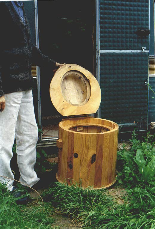 Nous avons construit plusieurs modèles de toilettes sèches., en général rondes ou ovales, et organisé des stages où l'on peut se construire sa propre toilette. L'avantage de ces toilettes, c'est qu'elles se placent n'importe où dans la maison, même près du lit d'une personne âgée et souffrante ... et ça ne sent pas ... mais il faut le voir, l'essayer au moins, pour le croire. Pour les grandes manifestations, nous avons fabriqué des dessus de toilette à encastrer sur de grandes poubelles noires, le tout sous une jolie tente à ossature bambou. En 97, nous avons ainsi géré écologiquement, en site rural, une rencontre de 100 personnes pendant 4 jours. Les expériences, toujours positives, se sont poursuivies les années suivantes... Nous estimons, en l'an 2 000, qu'à la suite de notre initiative, une centaine de familles au moins ont décidé de ne plus utiliser que des toilettes sèches, pour avoir la disponibilité d'un bon compost et par conscience écologique d'abord, puis par plaisir d'un autre confort au quotidien.