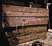 Remuer une dernière fois la paille, en prendre des paquets et remplir l'espace entre des banches (des planches ou des panneaux) en essayant d'aligner les fibres perpendiculairement aux banches (dans le sens de traversée du mur- enfin à peu près). Et de temps en temps une couche en sens opposé.
