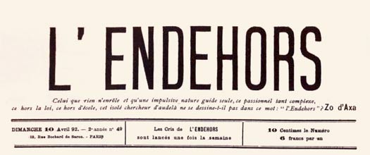 L'En Dehors, c'est le nom de la revue de Zo d'Axa (de son vrai nom : Alphonse Gallaud de la Pérouse), qui rassemblera, à partir de 1891, Octave Mirbeau, Bernard Lazare, Victor Barrucand, Félix Fénéon, Georges Darien... Tous ceux pour qui La Révolte, le journal anarchiste de Jean Grave (le pape de la rue Mouffetard), semblait trop sérieux, trop orthodoxe". Son ambition en créant le journal était de donner une feuille libre aux écrivains impatients de parler sans retenue, une tribune où chacun pourrait aller jusqu'au bout de sa pensée : un groupement sans idéal, sans hiérarchie, dans lequel l'artiste s'épanouirait. Journal au titre insolite, à la mise en page dite à l'américaine, L'Endehors porte en épigraphe : " Celui que rien n'enrôle et qu'une impulsive nature guide seule, le passionnel complexe, le hors-la-loi, le hors-d'école, l'isolé chercheur d'au-delà ".